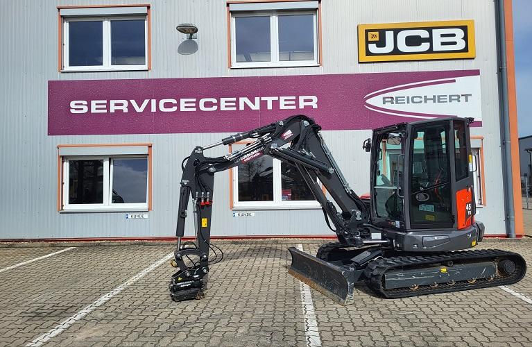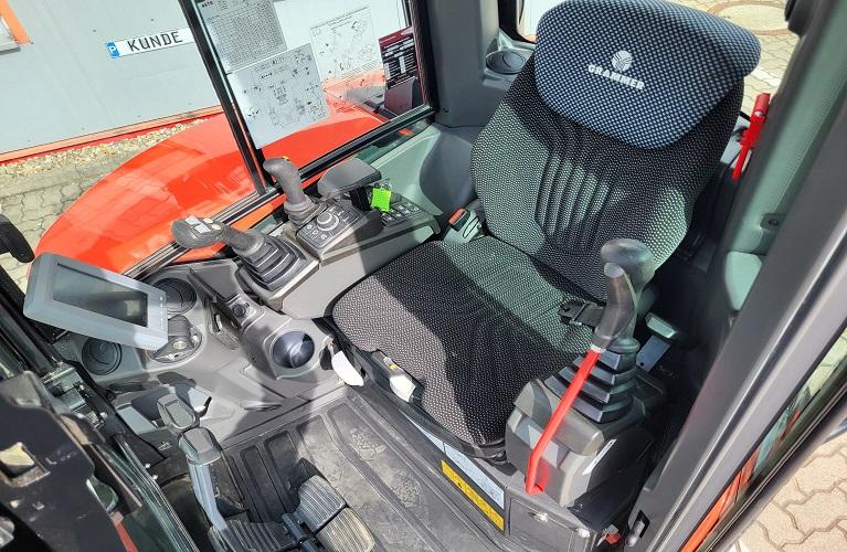 Ausstattung: LOAD SENSING Hydraulik – Flow Sharing Steuerblock und elektronisch gesteuerter Load Sensing Pumpe mit Arbeitsmodus ECO – Standard – Power, Automatische Drehzahlreduzierung, Planierschild, Gummiketten, Klappbare abgefederte Kabine ROPS /TOPS – FOPS mit Heizung und Klimaanlage, Heckkamera, zwei Fahrgeschwindigkeiten (automatisch geschalten), hydraulischer Schnellwechsler, drei Hydrauliksteuerkreise doppeltwirkend elektroproportional gesteuert einstellbar, elektrische Umschaltung von Hammer auf Schwenklöffel, Bordcomputer mit Multifunktionsdisplay zur Diagnostik mit: Einstellung der Litermengen und der Sensibilität Hydraulik, Einstellung Arbeitsmodus (ECO – Standard – Power), Einstellung Zeitintervall Autoidle, Partikelfilter Management, Lasthalteventil auf ersten, zweiten und dritten Arm, elektrische Dieselbetankungspumpe, Überlastwarneinrichtung, Lasthaken auf Kolbenstange, luftgefederter Sitz, 1 LED Balken vorne auf Kabine und 1 LED Balken vorne über Lüftung, LED Scheinwerfer im Ausleger, Autoradio mit USB – Anschluss u. Bluetooth, Rückspiegel rechts, Zusatzgewicht 200 kg